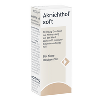Aknichthol Soft 1 % Emulsion zur Anwendung auf der Haut (Lotio). Wirkstoff: Natriumbituminosulfonat (Ichthyol-Natrium), hell. Anwendungsgebiete: dient zur Kurzzeitanwendung (max. 9 Tage): Zur Behandlung von Belastungsschmerzen bei Kniegelenksarthrose.