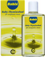 Babix-Baby-Thymianbad für entspanntes Atmen bei Erkältung. Babix-Baby-Thymianbad ist ein Badezusatz zur Zubereitung von Bädern mit natürlichem Thymianöl. Babix-Baby-Thymianbad wurde speziell für Babys entwickelt. Die Hautverträglichkeit ist dermatologisch getestet und bestätigt. Babix-Baby-Thymianbad eignet sich für Babys ab 3 Monaten und Kinder jeden Alters. Babix-Baby-Thymianbad beruhigt und entspannt durch den wohltuenden Duft des Thymianöls. Durch die Wärme und der liebevollen Zuwendung während des Bades, verbunden mit dem wohltuenden Duft des Thymians, wird das Bad zum Wohlfühlbad und sorgt für Entspannung. So hilft Babix-Baby-Thymianbad den kleinen Patienten in der Nacht besser durchzuschlafen.