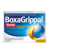 BoxaGrippal forte Erkältungstabletten 400 mg/60 mg Filmtabletten. Wirkstoff: Ibuprofen/Pseudoephedrinhydrochlorid. Anwendungsgebiete: Zur symptomatischen Behandlung der Schleimhautschwellung von Nase und Nebenhöhlen verbunden mit Kopfschmerzen, Fieber und erkältungsbedingten Schmerzen bei Jugendlichen ab 15 Jahren und Erwachsenen. Enthalten Lactose und Natrium.