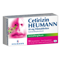Cetirizin Heumann 10 mg Filmtabletten. Wirkstoff: Cetirizindihydrochlorid. Anwendungsgebiete: zur Linderung von Nasen- und Augensymptomen bei saisonaler und ganzjähriger allergischer Rhinitis und zur Linderung von chronischer Nesselsucht (chronischer idiopathischer Urtikaria). Warnhinweise: Enthält Lactose.