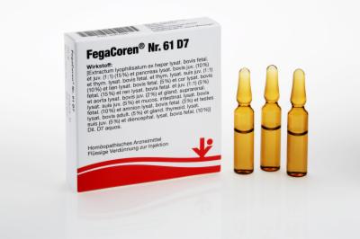 FegaCoren Nr. 61 D7, Flüssige Verdünnung zur Injektion. Wirkstoff: [Extractum lyophilisatum ex hepar lysat. bovis fetal. et juv. (1:1) (15%) et pancreas lysat. bovis juv. (10%) et thym. lysat. bovis fetal. et thym. lysat. suis juv. (1:1) (10%) et lien lysat. bovis fetal. (5%) et cor lysat. bovis fetal. (15%) et ren lysat. bovis fetal. et juv. (1:1) (5%) et aorta lysat. bovis juv. (2%) et gland. suprarenal. lysat. suis juv. (5%) et mucos. intestinal. lysat. bovis fetal. (10%) et amnion lysat. bovis fetal. (3%) et testes lysat. bovis adult. (5%) et gland. thyreoid. lysat. suis juv. (5%) et diencephal. lysat. bovis fetal. (10%)] Dil. D7 aquos. (HAB, V. 5b ). Anwendungsgebiete: Registriertes homöopathisches Arzneimittel, daher ohne Angabe einer therapeutischen Indikation.