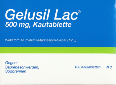 Gelusil Lac, 500 mg, Kautabletten. Wirkstoff: Aluminium-Magnesium-Silicat (1:2:3). Anwendungsgebiete: bei Säurebeschwerden verschiedener Art wie Sodbrennen oder saures Aufstoßen und zur unterstützenden Therapie bei Ulcus ventriculi oder Ulcus duodeni.