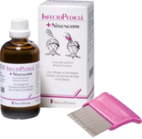Infecto Pedicul mit Nissenkamm, Lösung 430 mg/100 ml Wirkstoff: Permethrin. Anwendungsgebiete: Lösung zur einmaligen äußerlichen Behandlung des Kopfhaares bei Befall mit Kopfläusen (Pediculus capitis). Der Nissenkamm wird angewendet, um Läuseeier und Nissen (leere Eihüllen) aus den Haaren zu entfernen. Warnhinweis: Enthält 39 Vol.-% Alkohol!