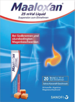 Maaloxan 25 mVal Liquid ist ein Mittel zur Bindung überschüssiger Magensäure und besteht aus den beiden Wirkstoffen Algeldrat (Aluminiumhydroxid-Gel) und Magnesiumhydroxid. Maaloxan 25 mVal neutralisiert die überschüssige Magensäure und lindert damit den Schmerz und die Beschwerden. Maaloxan 25 mVal Liquid wird angewendet zur symptomatischen Behandlung von Erkrankungen, bei denen die Magensäure gebunden werden soll:- Sodbrennen und säurebedingte Magenbeschwerden,