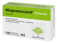 Magnesiocard 2,5 mmol ist ein Mineralstoffpräparat. Magnesiocard 2,5 mmol wird angewendet zur Behandlung von therapiebedürftigen Magnesiummangelzuständen, die keiner Injektion/Infusion bedürfen und bei nachgewiesenem Magnesiummangel, wenn er Ursache für Störungen der Muskeltätigkeit (neuromuskuläre Störungen, Wadenkrämpfe) ist.