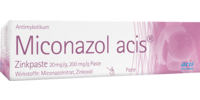 Miconazol acis Zinkpaste ist ein pilztötendes Arzneimittel zur äußerlichen Behandlung von Pilzerkrankungen der Haut (Antimykotikum). Miconazol acis Zinkpaste wird angewendet zur Behandlung schwerer Formen der Windeldermatitis, bei der eine nachgewiesene Besiedlung mit Hefepilzen (Candida spp.) im Vordergrund steht. Miconazol acis Zinkpaste wird angewendet bei Säuglingen, Kindern und Erwachsenen.