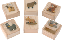 Milchzahndose aus Holz, verschiedene Motive sortiert.