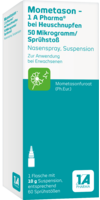 Mometason - 1 A Pharma bei Heuschnupfen 50 Mikrogramm/Sprühstoß Nasenspray, Suspension. Wirkstoff: Mometasonfuroat (Ph.Eur.) Anwendungsgebiete: Zur Behandlung der Beschwerden eines Heuschnupfens bei Erwachsenen, sofern die Erstdiagnose des Heuschnupfens durch einen Arzt erfolgt ist. Warnhinweis: Enthält Benzalkoniumchlorid.