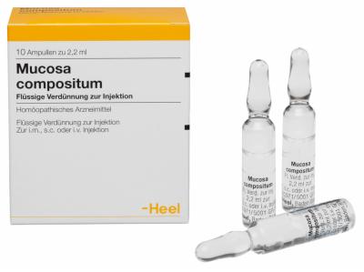 Mucosa compositum, Flüssige Verdünnung zur Injektion. Anwendungsgebiete: Registriertes homöopathisches Arzneimittel, daher ohne Angabe einer therapeutischen Indikation.