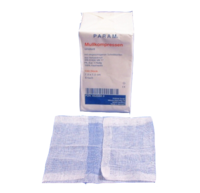 Baumwoll-Mullkompressen zur äußeren Wundversorgung, mit eingeschlagenen Schnittkanten 8-fach, 17-fädig, aus Verbandmull, EN 14079.- Artikelbezeichnung: Mullkompressen, unsteril.