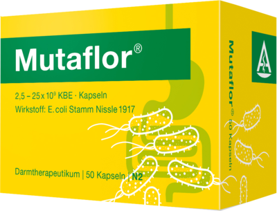 Mutaflor Kapseln. Wirkstoff: Escherichia coli Stamm Nissle 1917. Anwendungsgebiete: bei einer Entzündung des Dickdarms (Colitis ulcerosa) in der schubfreien Zeit (Remissionsphase) und bei lang andauernder Verstopfung (chronischer Obstipation).