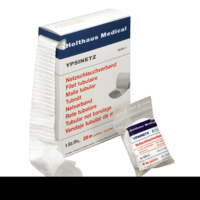 Nahtlos gewirkter hochelastischer Schlauch zur Fixierung von Wundauflagen. Aus 66% Baumwolle, 25% Polyamid und 9% Elasthan, weiß.