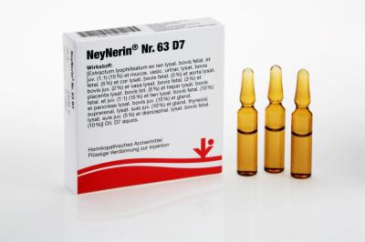 NeyNerin Nr. 63 D7. Wirkstoff: [Extractum lyophilisatum ex ren lysat. bovis fetal, et juv. (1:1) (15%) et mucos. vesic. urinar. lysat. bovis fetal. (5%) et cor lysat. bovis fetal. (5 %) et aorta lysat. bovis juv. (2 %) et vasa lysat. bovis fetal. (3%) et placenta lysat. bovis tot. (5%) et hepar lysat. bovis fetal, et juv. (1:1) (15%) et lien lysat. bovis fetal. (10%) et pancreas lysat. bovis juv. (15%) et gland. suprarenal, lysat. suis juv. (10%) et gland. thyreoid. lysat. suis juv. (5 %) et diencephal. lysat. bovis fetal. (10 %)] Dil. D7 aquos. Anwendungsgebiete: Registriertes homöopathisches Arzneimittel, daher ohne Angabe einer therapeutischen Indikation.