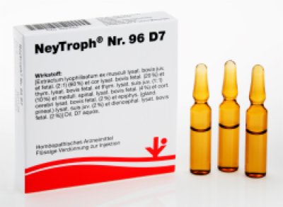 NeyTroph Nr. 96 D7, Flüssige Verdünnung zur Injektion. Wirkstoff: [Extractum lyophilisatum ex musculi lysat. bovis juv. et fetal. (2:1) (60%) et cor lysat. bovis fetal. (20%) et thym. lysat. bovis fetal. et thym. lysat. suis juv.(1:1) (10%) et medull. spinal. lysat. bovis fetal. (4%) et cort. cerebri lysat. bovis fetal. (2%) et epiphys. (gland. pineal.) lysat. suis juv. (2%) et diencephal. lysat. bovis fetal. (2%)] Dil. D7 aquos. Anwendungsgebiete: Registriertes homöopathisches Arzneimittel, daher ohne Angabe einer therapeutischen Indikation.