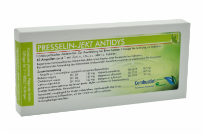 Presselin-Jekt Antidys, Flüssige Verdünnung zur Injektion. Anwendungsgebiete: Registriertes homöopathisches Arzneimittel, daher ohne Angabe einer therapeutischen Indikation.