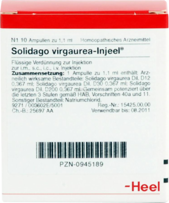 Solidago virgaurea-Injeel, Flüssige Verdünnung zur Injektion. Anwendungsgebiete: Registriertes homöopathisches Arzneimittel, daher ohne Angabe einer therapeutischen Indikation.