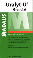 Uralyt-U Granulat. Wirkstoff: Kalium-Natrium-Hydrogencitrat (6:6:3:5). Anwendungsgebiete: zur Auflösung von Harnsäuresteinen und zur Metaphylaxe (Verhinderung einer erneuten Bildung) von Calcium- und Harnsäuresteinen, bzw. Mischsteinen aus Calciumoxalat/Harnsäure oder Calciumoxalat/Calciumphosphat.