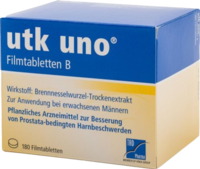 utk uno Filmtabletten B. Wirkstoff: Brennnesselwurzel-Trockenextrakt. Anwendungsgebiete: pflanzliches Arzneimittel zur Besserung von Prostata-bedingten Harnbeschwerden. Warnhinweis: Enthält Lactose.