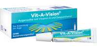 Vit-A-Vision wird zur lang anhaltenden Verbesserung des Tränenfilms und zum intensiven Schutz der Augenoberfläche angewendet. Seine zellprotektiven Eigenschaften ermöglichen eine normale Re-Epithelisierung, wenn diese durch Trockenheit beeinträchtigt ist. Durch die sehr weiche und geschmeidige Konsistenz lässt sich Vit-A-Vision sehr gut auf der Augenoberfläche verteilen. Die Salbe zeichnet sich durch besonders gute Verträglichkeit aus, vor allem durch das darin enthaltene Vitamin A, einem natürlichen Bestandteil des Tränenfilms. Vit-A-Vision lindert Symptome wie Brennen, Trockenheit oder Müdigkeit der Augen. Die Augenlider gleiten problemlos über Horn- und Bindehaut. Dexpanthenol, das im Körper zu Pantothensäure umgewandelt wird, gehört zu den B-Vitaminen. Dexpanthenol erhöht die Wasserbindungskapazität, es wird gut von der Haut aufgenommen und besitzt pflegende Eigenschaften.