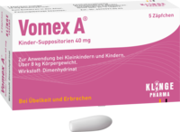 Vomex A Kinder-Suppositorien 40 mg Zäpfchen. Wirkstoff: Dimenhydrinat. Anwendungsgebiete: zur Vorbeugung und Behandlung von Übelkeit und Erbrechen unterschiedlichen Ursprungs, insbesondere bei Reisekrankheit.